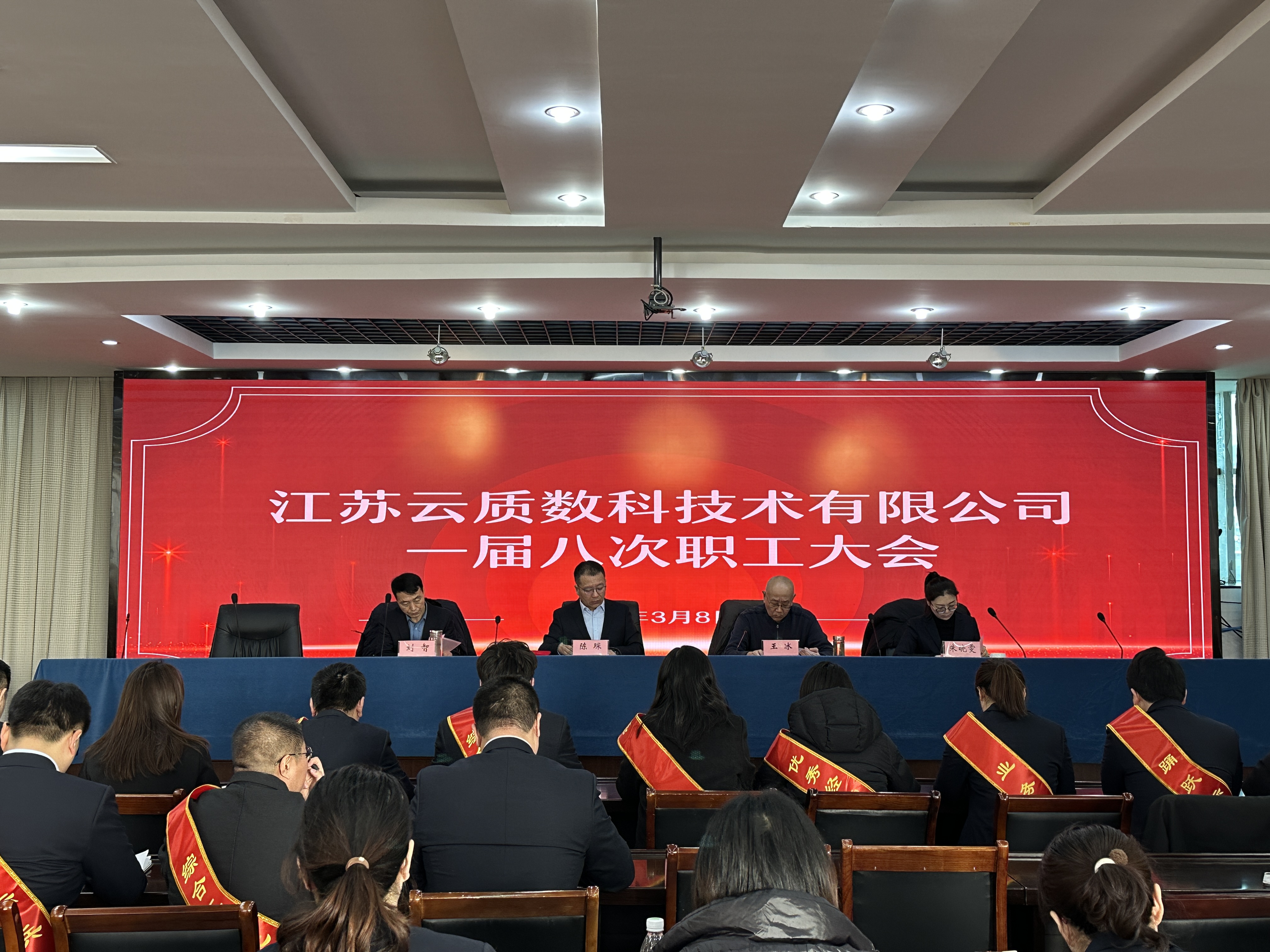 2025年3月8日上午9時,江蘇云質數科技術有限公司2025年度一屆八次職工大會隆重召開。公司全體職工齊聚一堂,共商企業發展大計,擘畫新一年藍圖。會議由朱曉雯主持,黨支部書記、董事長陳琛作重要講話。
